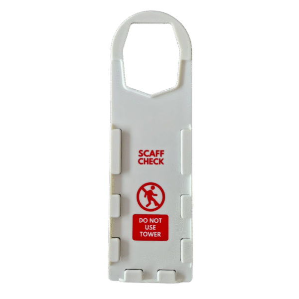 The ScaffCheck Tower Tag is a durable, double-sided identification and inspection tag specifically designed for mobile access towers. It ensures that each tower’s safety status is clearly visible, helping maintain compliance and prevent misuse.