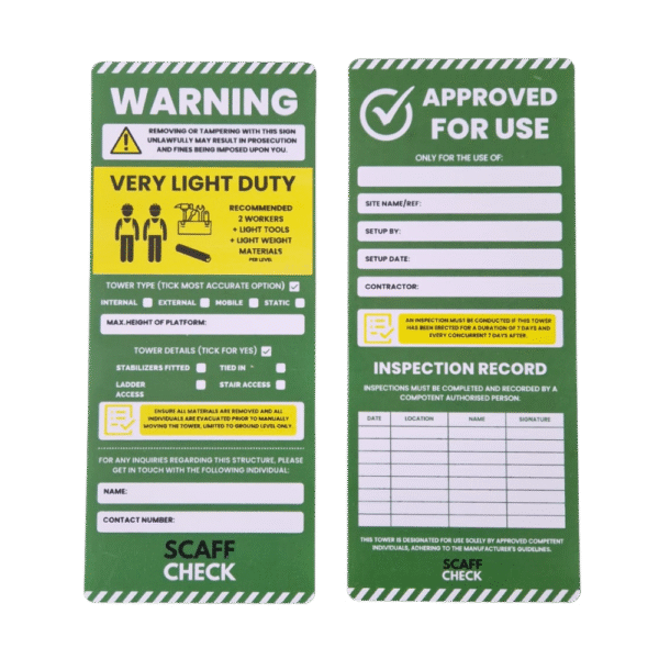 Ideal for scaffolders, tower hire companies and site managers who need a reliable tagging solution for tower inspections.